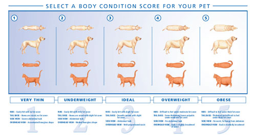 The most practical and objective way of determining your pet’s healthy weight is to use a visual guide known as Body Condition Score or BCS. Veterinarians use a BCS to standardize the level of a pet’s weight and formulate a diet and exercise plan that best suits his/her body, activity level and lifestyle.